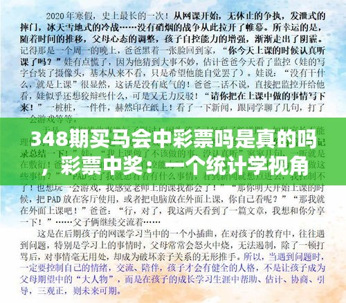 “348期买马会中彩票吗是真的吗”是一个错误的说法,我们应当从统计学视角理性看待彩票中奖问题,合理规划购彩行为,同时加强政策引导和管理,倡导健康向上的生活方式。