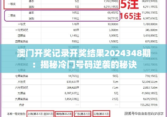 在“澳门开奖记录:冷门号码的逆袭”这一部分,文章通过收集和整理澳门博彩局官方网站的澳门彩票开奖记录,揭示了冷门号码逆袭的现象,文章指出,冷门号码逆袭的原因在于彩票开奖号码是随机生成的,具有不确定性和随机性,以2024348期澳门彩票为例,冷门号码逆袭的现象尤为突出,冷门号码逆袭的另一个原因是彩民的投注心理,许多彩民选择放弃热门号码的投注,更加关注一些冷门号码,这种策略反而增加了冷门号码逆袭的概率。