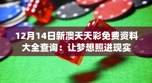 在澳门特别行政区,多样化的政策文件对于加强居民对于相关信息的认知尤为关键。此次发布的文章聚焦于"12月14日新澳天天彩免费资料大全查询:让梦想照进现实",它旨在推广澳门政府提供的福利政策,让更多居民受益于这一务实的资源。为充分增加公众对这一政策的了解和兴趣,特发布此篇文章作详细解读。