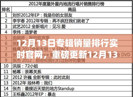 本次12月13日专辑销量排行实时官网的更新为我们展示了音乐界的巅峰之战,我们看到了实力唱将的经典之作,也看到了新晋歌手的惊艳表现,正是有了粉丝们的支持和官网的实时更新,我们才能够随时掌握音乐市场的最新动态,你Pick的专辑上榜了吗?快来一起看看吧!