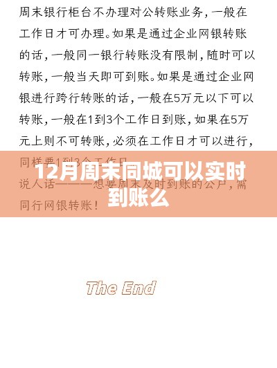 随着金融科技的飞速发展,人们对于资金流转的效率要求越来越高,特别是在节假日或周末,当大家需要进行紧急的资金转账时,往往关心的一个重要问题就是:在特定的时间点,如12月的周末,同城转账能否实时到账?本文将就此问题展开探讨,并为大家解析相关因素。