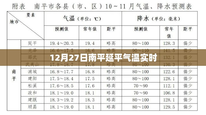 截至12月27日,南平延平地区的气温已经降至较低水平,白天的气温较为温和,但夜晚的气温则较为寒冷,根据最新的气象数据显示,当日最高气温约为XX℃,最低气温约为XX℃,由于天气状况的变化,气温可能会有所波动,建议市民朋友们及时关注天气预报,做好保暖措施。