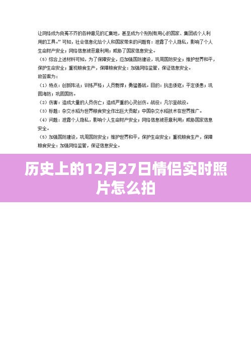 拍摄历史上的12月27日情侣实时照片需要充分的准备和技巧,通过选择合适的地点、服装和道具,运用拍摄技巧和后期制作,可以记录下珍贵的瞬间,留下美好的回忆,在拍摄过程中,注意尊重隐私、确保安全,并真实记录情感和瞬间,希望本文的建议和技巧能帮助你拍摄出满意的情侣实时照片。