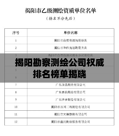 揭阳,作为广东省的一个重要城市,近年来在经济、文化等方面取得了显著的发展,随着城市的快速发展,勘察测绘行业在此也日渐繁荣,本文将为您介绍揭阳地区的勘察测绘公司排名,以助您更好地了解该行业的现状。