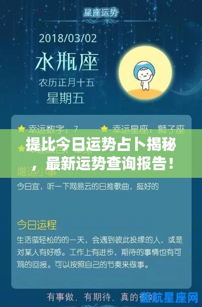随着人们对生活品质和个人发展的关注度不断提高,越来越多的人开始关注自己的运势,在这个信息发达的时代,我们可以通过多种渠道查询自己的运势,以便更好地面对生活中的挑战和机遇,本文将围绕“提比今日运势查询最新”这一主题,探讨如何获取最新的运势信息,以及如何正确看待和运用这些信息。