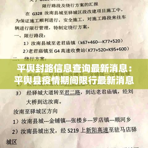 近日,平舆县因应对突发公共卫生事件,采取了封路措施以确保居民的安全和健康。为了及时了解封路信息,保障市民的正常生活,相关部门开通了专门的封路信息查询渠道,以便市民能够第一时间获取最新的封路动态。