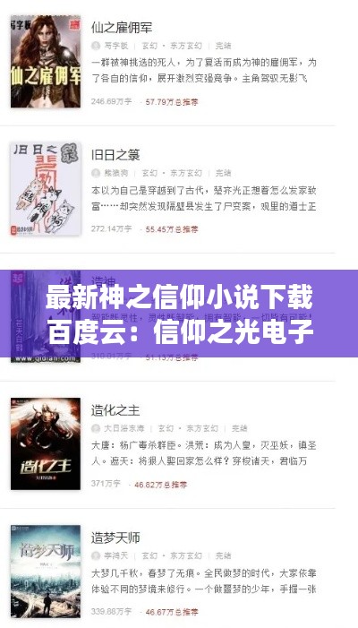 神之信仰小说,顾名思义,是以宗教信仰、神话传说为背景的小说。这类小说往往具有丰富的想象力,通过对神祇、神话人物的描绘,展现出一个神秘而奇幻的世界。近年来,随着玄幻、奇幻等题材的兴起,神之信仰小说也逐渐成为了网络小说的一个重要分支。