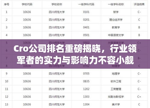 随着生物科技领域的飞速发展,CRO(Contract Research Organization)行业在全球范围内呈现出持续增长的趋势,本文将为您详细介绍2021年Cro公司的排名,带您了解这些行业领军者的实力与影响力。