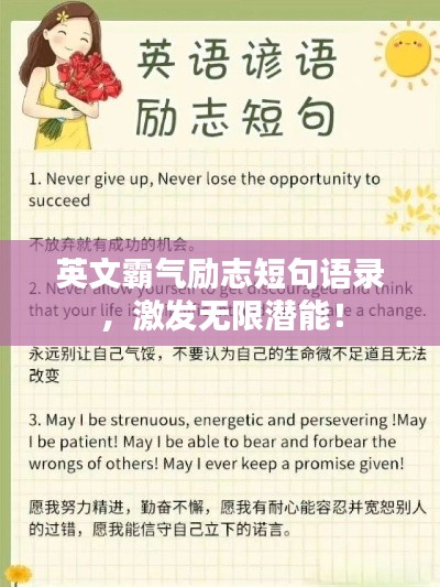 在人生的旅途中,我们总会遇到各种挑战和困难,为了激励自己不断前行,有时候我们需要一些充满力量的励志语录来提醒自己,以下是一些英文的霸气励志短句,希望能为你带来正能量,激发你追求梦想的勇气。