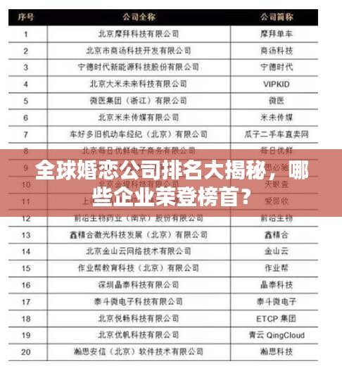 随着科技的进步和社会的发展,婚恋行业在全球范围内蓬勃发展,尤其是那些拥有雄厚实力和广泛影响力的婚恋公司,以下是世界上最大的几家婚恋公司的排名,它们以其独特的业务模式、优质的服务和广阔的市场覆盖赢得了广大用户的信赖和喜爱。