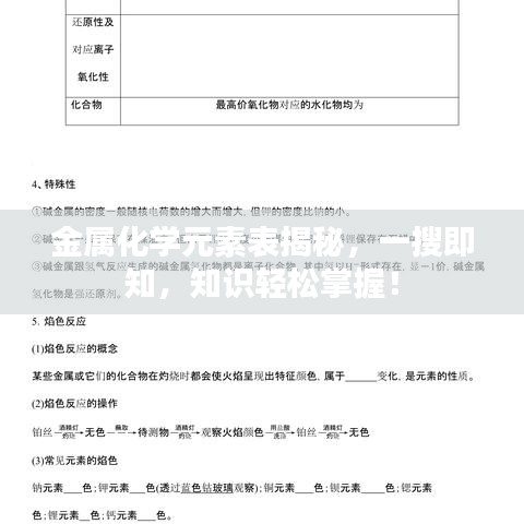 金属化学元素表是我们了解和研究金属元素的重要工具,通过百度一下,我们可以轻松获取丰富的资源,深入了解金属元素的性质和应用,让我们共同掌握这一知识宝库,为科技创新和未来发展贡献力量。