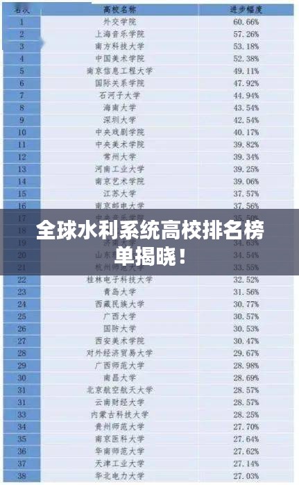 世界水利系统的高校排名反映了全球范围内水利学科的发展水平,了解排名情况,对于选择优质教育资源、推动水利学科的发展具有重要意义,我们将继续关注世界水利系统的高校排名,为推动全球水资源管理与保护贡献智慧和力量。