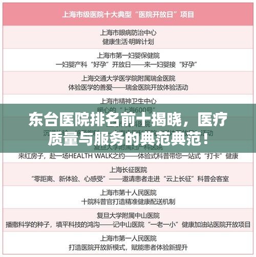 东台医院排名前十名的医院是东台地区医疗质量与服务的标杆,它们为东台地区的医疗卫生事业做出了突出贡献,在未来,我们期待这些医院能够继续发挥自身优势,不断提高医疗质量和服务水平,为更多患者提供更优质、更高效的医疗服务。