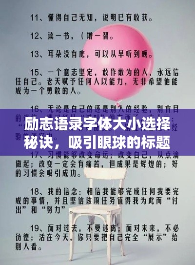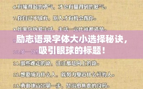字体大小的选择应根据受众的阅读习惯和体验来决定,不同的场合和受众可能需要不同的字体大小,在公共场所展示的大型励志标语,为了吸引人们的注意力,字体大小可能需要较大,而在个人笔记本或社交媒体上的励志语录,字体大小则可以根据一般阅读习惯来选择。
