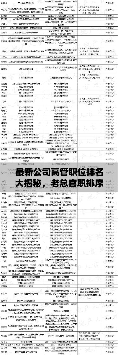 在当今社会,随着经济的飞速发展,各大公司的老总们承担着重要的角色和责任,他们的官职排序不仅体现了公司的组织结构和管理体系,也反映了公司的规模和业务范围,本文旨在为读者呈现最新的公司老总官职排序表,并对相关内容进行深入分析。
