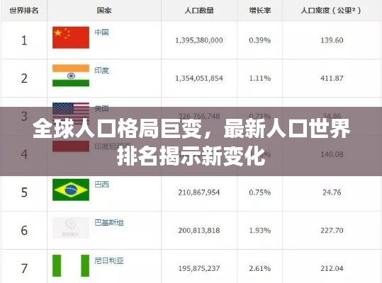 随着全球经济的不断发展和人民生活水平的提高,人口数量及其分布格局也在不断变化,人口世界排名,作为反映各国或地区人口数量多少的重要指标,一直备受关注,本文将结合最新数据,对人口世界排名进行分析,探讨全球人口格局的新变化。