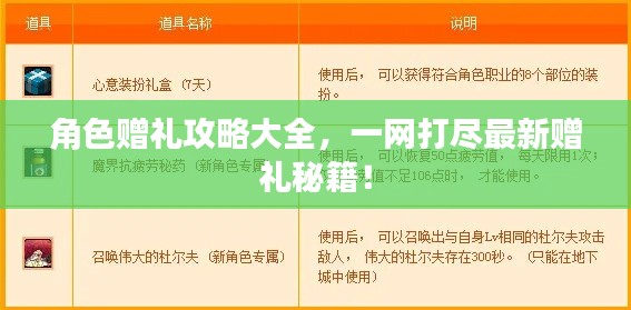 在游戏世界中,角色赠礼是一种特殊的互动方式,不仅能加深玩家与角色之间的情感联系,还能提升角色的属性,增强战斗力,本文将为大家带来一份全面的角色赠礼攻略,帮助大家了解如何为心仪的角色送上最贴心的礼物。